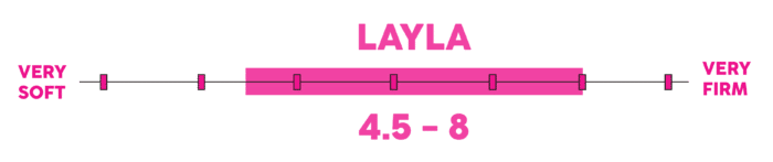 Layla mattresses have a firmness of 4.5 to 8 out of 10 (where 10 is the most firm), depending on their size and model. This range makes them suitable for different body types and sleeping positions.