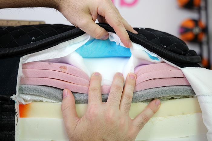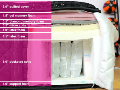 Materials: pillow top cover, memory foam, diamond memory foam, micro coils, latex foam, pocketed coils, support foam