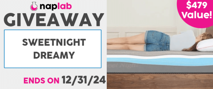 Enter now for a chance to win a brand new SweetNight Dreamy mattress! This all foam memory foam mattress is valued at $479 (King sized). One grand prize winner will win a Dreamy mattress in their preferred size (Twin, Full, Queen, or King) and in their preferred thickness (10″ or 12″).