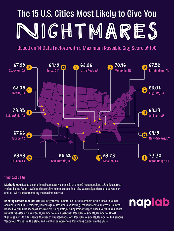 Cities in the South and Southwest also showed strong potential for nightmares, with Tucson, Arizona; San Antonio, Texas; and Birmingham, Alabama, all making the top 10. Interestingly, each of the top 15 cities almost entirely falls in the lower half of the country. Everyone must sleep soundly in the North!