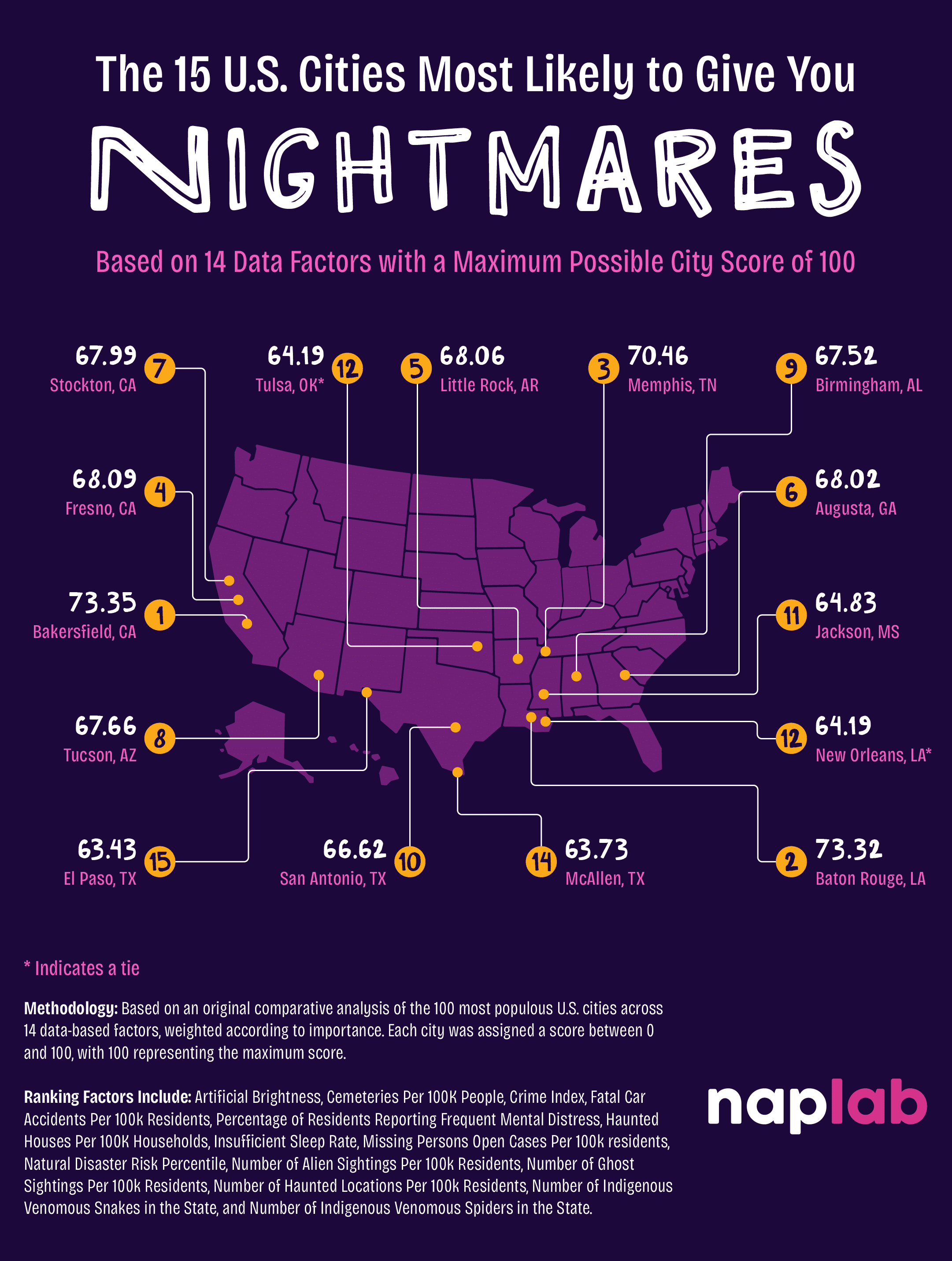 If you’re looking for peaceful dreams, some cities may stack the odds against you. Bakersfield, California, landed the top spot with a total score of 73.35, edging out Baton Rouge, Louisiana, by just a hair. Memphis, Tennessee, rounded out the top three, followed closely by cities in California, Arkansas, and Georgia. Notably, California appears three times within the top seven, making it one of the most nightmare-dense states on the list.