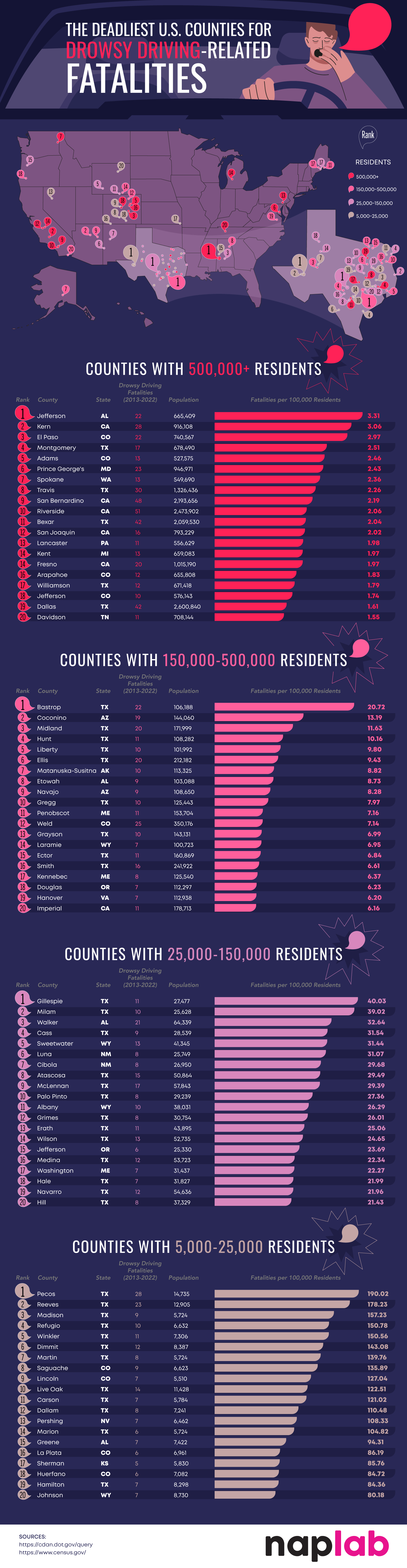 Our research team at NapLab analyzed data from the National Highway Traffic Safety Administration to determine which U.S. counties had the highest rate of drowsy driving-related fatalities between 2013 and 2022 compared to population.