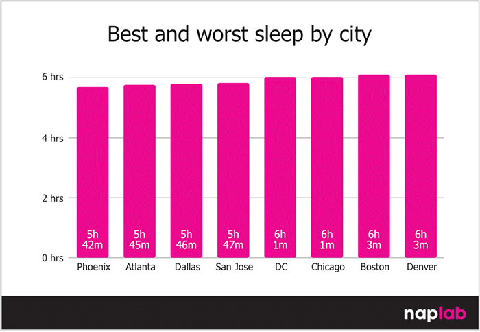 - In terms of cities, Phoenix averages the lowest sleep among major US cities, at 5 hours and 42 minutes per night, followed by Atlanta (5h 45m), Dallas (5h 46m), and San Jose (5h 47m).
