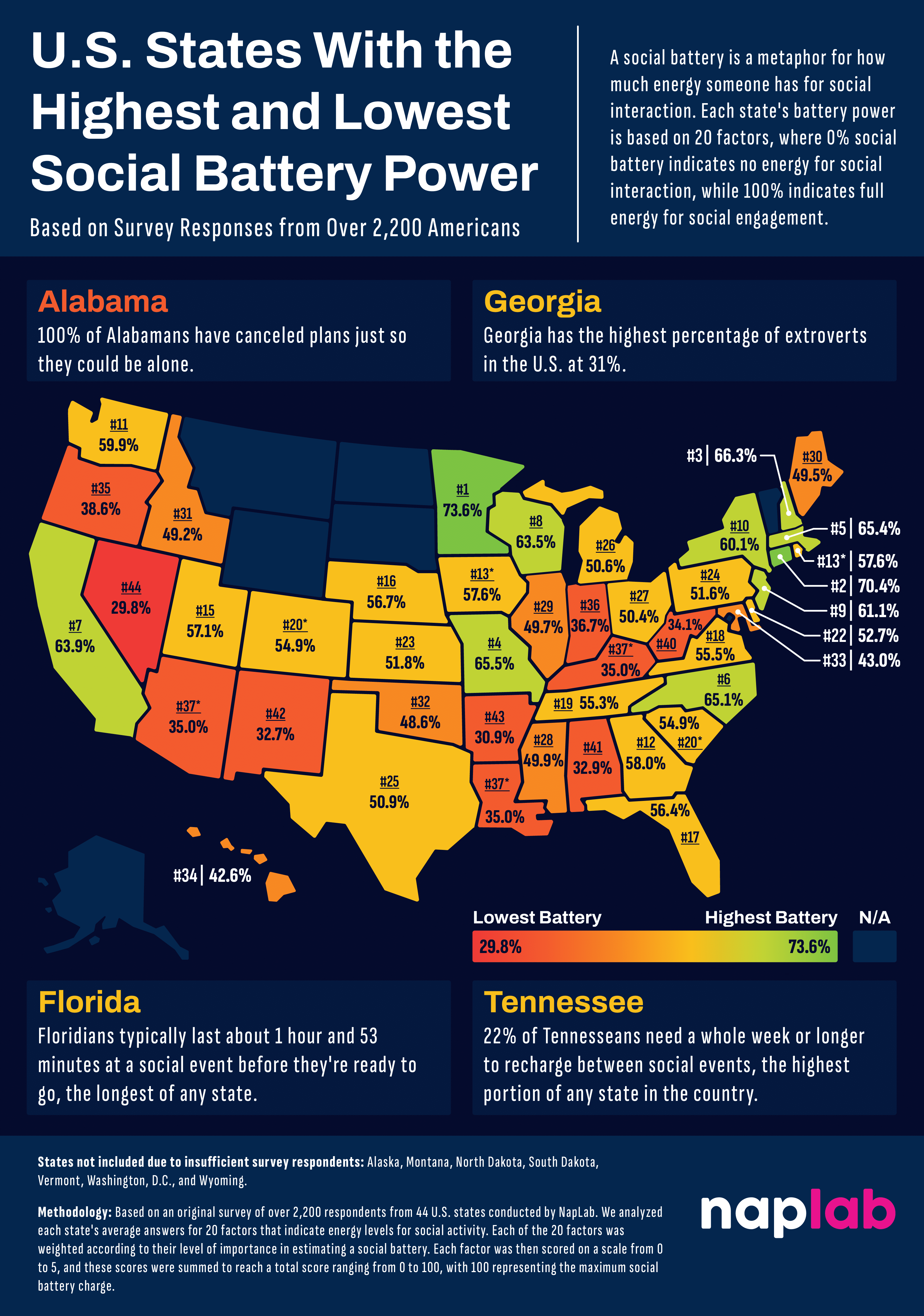 - Minnesota has the highest social battery percentage at 73.6%