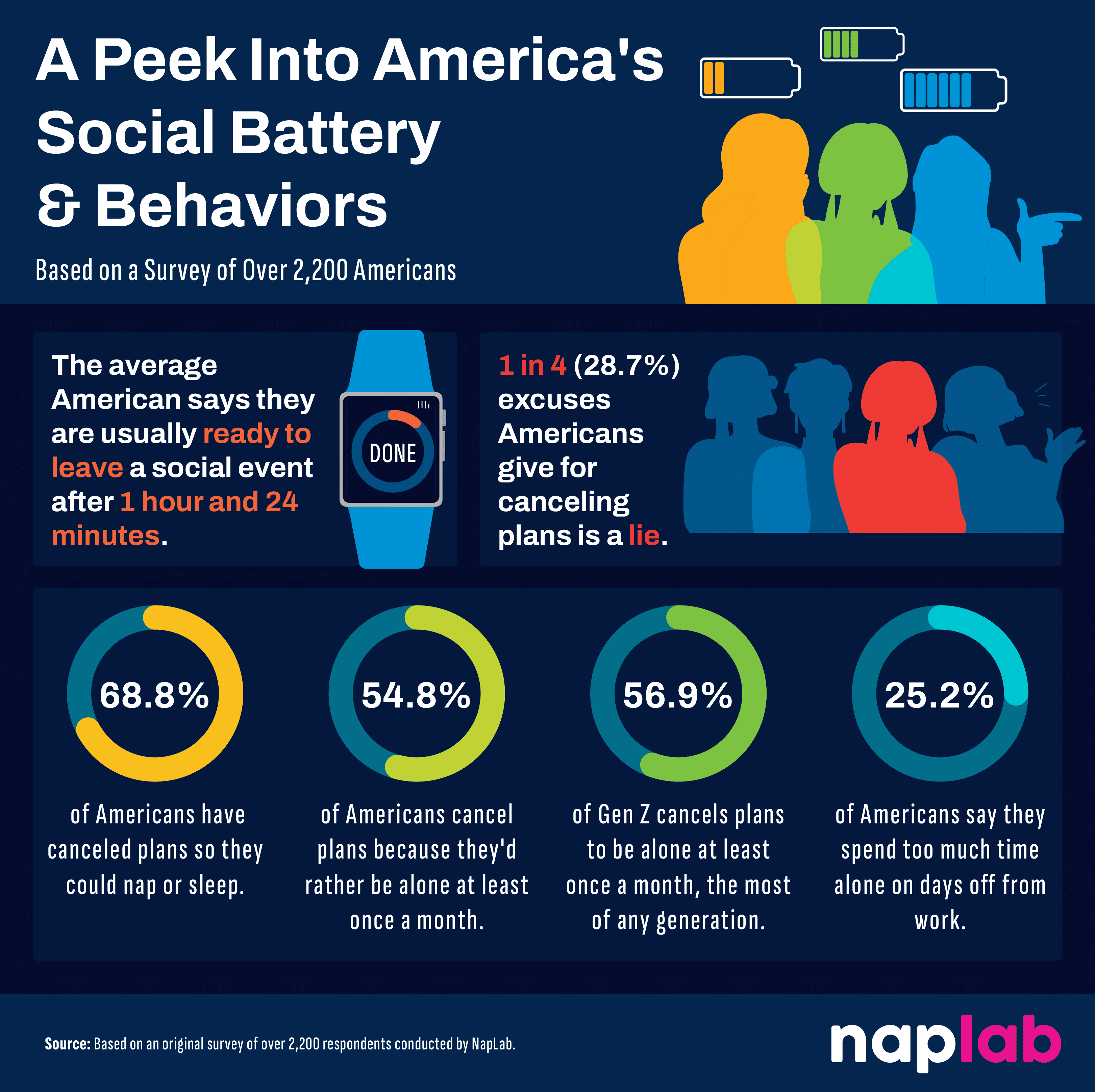 - When it comes to canceling plans, nearly 1 in 4 of American’s excuses (28.7%) aren’t true. Whether it’s a “family emergency” or “feeling under the weather,” sometimes the real reason is simply a need for rest, as 68.8% of Americans admit to canceling plans specifically to nap or sleep.