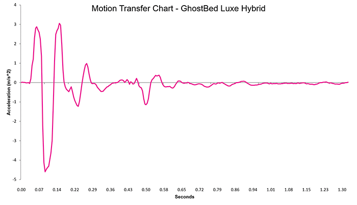In our motion transfer chart, which visualizes our accelerometer data, we can see the highest motion peaks from 0 to 0.14 seconds. Motion drops off immediately thereafter and by 0.76 seconds, we’ve returned to near-zero levels of energy.