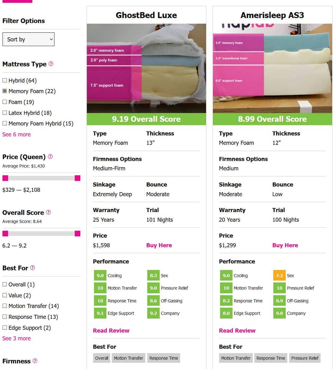 Quickly compare scores, performance and data for up to 3 different mattresses side-by-side.